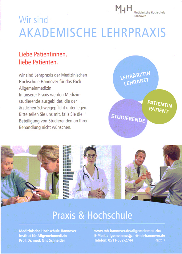 Zudem wurde unsere Praxis als Akademische Lehrpraxis für die Universitäten MHH Hannover und Eppendorf Hamburg bestätigt. Bein uns können bereits während des Studiums Praktika und Kurse absolviert werden.