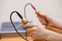 Bei der Resonanzfeldmessung werden mit feinster Messtechnik über Handelektroden die Eigenschwingung des Patienten abgegriffen, im Steuercomputer verstärkt und zurück gesendet.